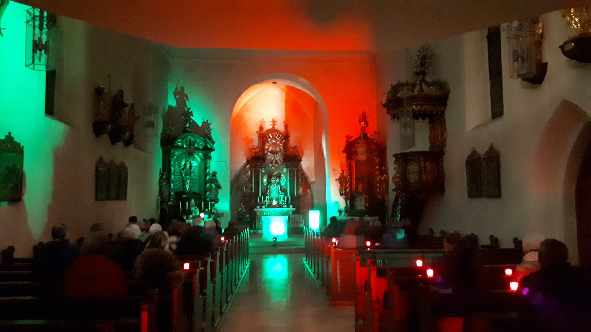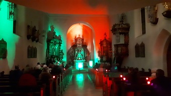 Gut angenommen wurde die spirituelle Nachtführung in der Pfarrkirche Reckendorf und in der Kuratiekirche Gerach im Januar und Februar. Hierbei konnten die Teilnehmenden einzelne Hoffnungsorte in den Kirchen neu entdecken. Das gezielt eingesetzte Licht im sonst dunklen Raum ermöglichte es, die einzelnen Orte innerhalb des Kirchenraumes neu wahrzunehmen.
