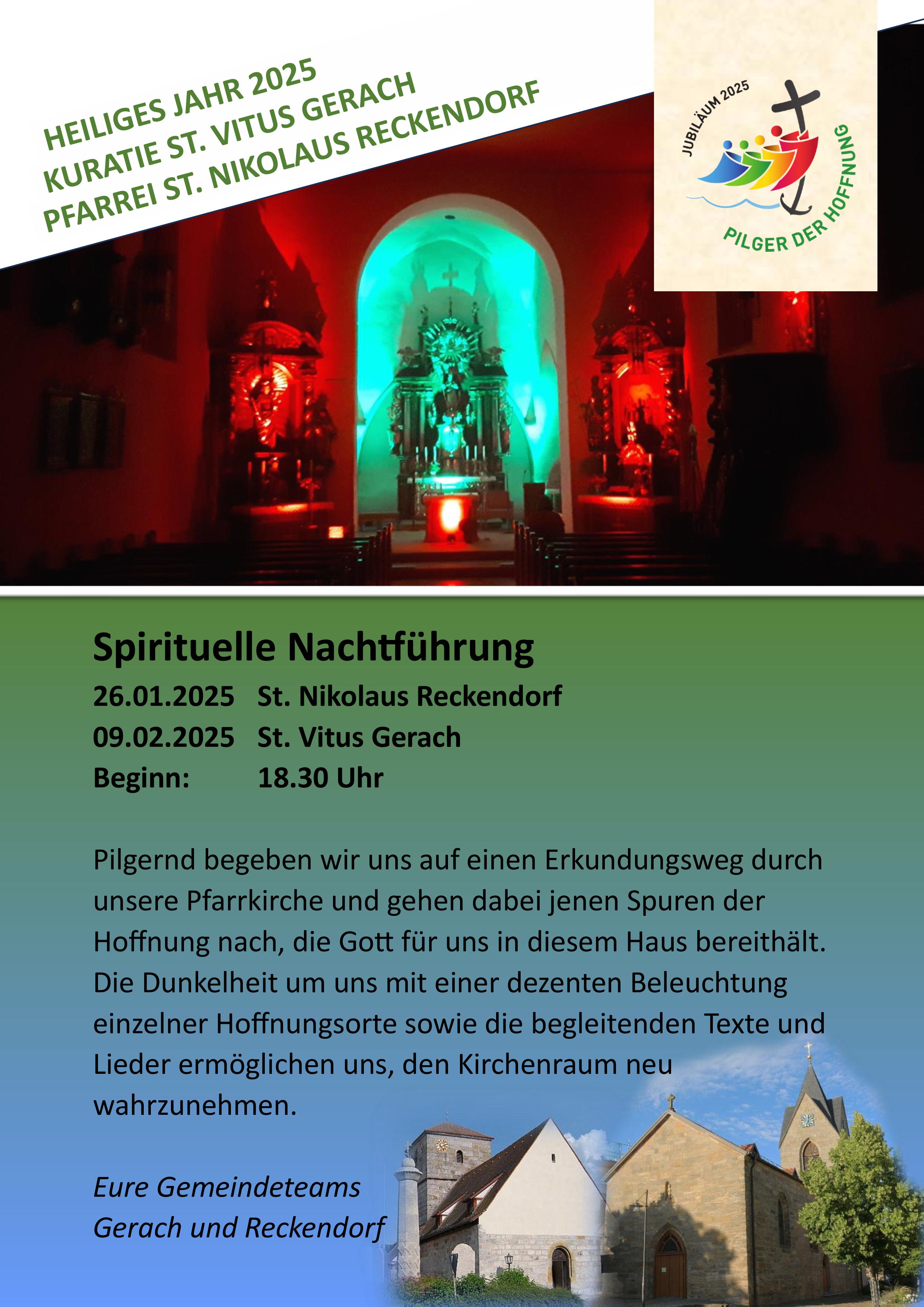 Pilgernd begeben wir uns auf einen Erkundungsweg durch unsere Pfarrkirche und gehen dabei jenen Spuren der Hoffnung nach, die Gott für uns in diesem Haus bereithält. Die Dunkelheit um uns mit einer dezenten Beleuchtung einzelner Hoffnungsorte sowie die begleitenden Texte und Lieder ermöglichen uns, den Kirchenraum neu wahrzunehmen.